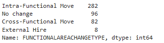 These are the counts per distinct value for the FUNCTIONALAREACHANGETYPE field for the churning employees: